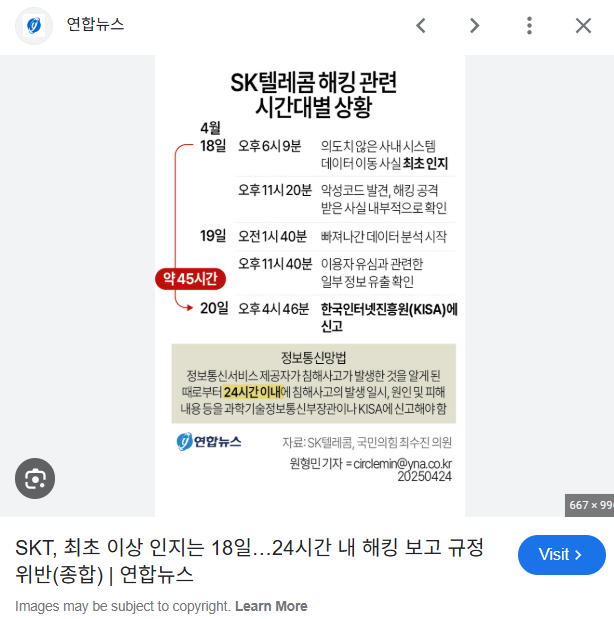 | 4월 22일 | SKT 서버, BPFDoor 악성코드로 해킹 → 고객 정보 유출 |