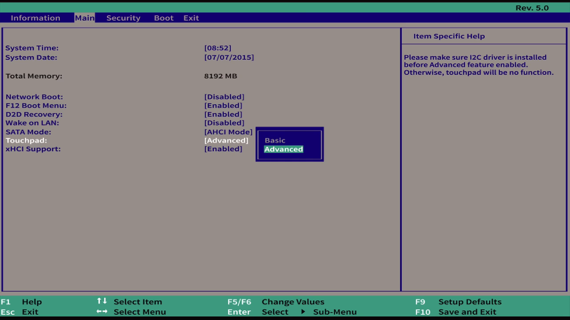 진입후 Main 탭에서 Touchpad항목에 들어가세요.